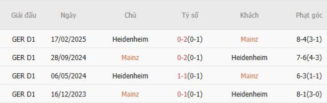 Thành tích đối đầu quá khứ giữa Mainz vs Heidenheim